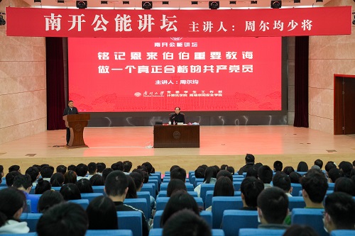 4月15日,国防大学原政治部主任、周恩来总理堂侄周尔均少将做客“南开公能讲坛”,受邀作“铭记恩来伯伯重要教诲 做一个真正合格的共产党员”主题讲座。全校教师学生党员代表共计三百余人参加。