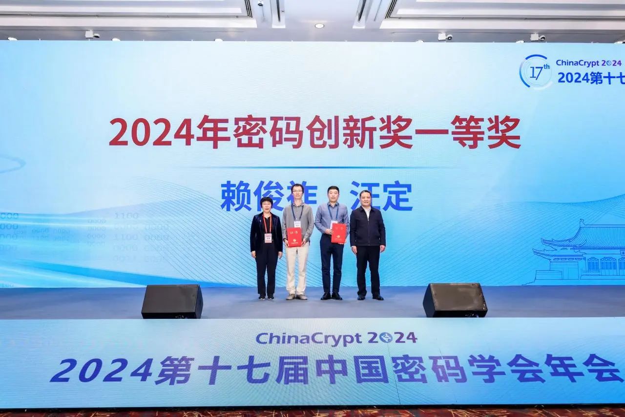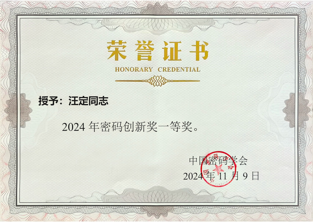 “密码创新奖”是由中国密码学会设立,经国家科技部和国家科学技术奖励工作办公室2013年4月批准的全国社会力量奖(国科社证字第0236号)。奖项授予在密码领域做出创造性贡献的50周岁以下的密码科技工作者,旨在推动密码学术的进步与创新,促进密码科技应用与发展,激励密码科技工作者为我国密码科技事业建功立业。奖项每两年颁发一次,设特等奖1名,一等奖2名,二等奖6名,名额可空缺。2024年度无特等奖,颁共发一等奖2名,二等奖6名。历史上,该奖项的特等奖仅由王小云院士1人获得,一等奖此前仅有6人获得。汪定教授因在密钥安全、密码协议领域作出的创新性突破而获得一等奖。