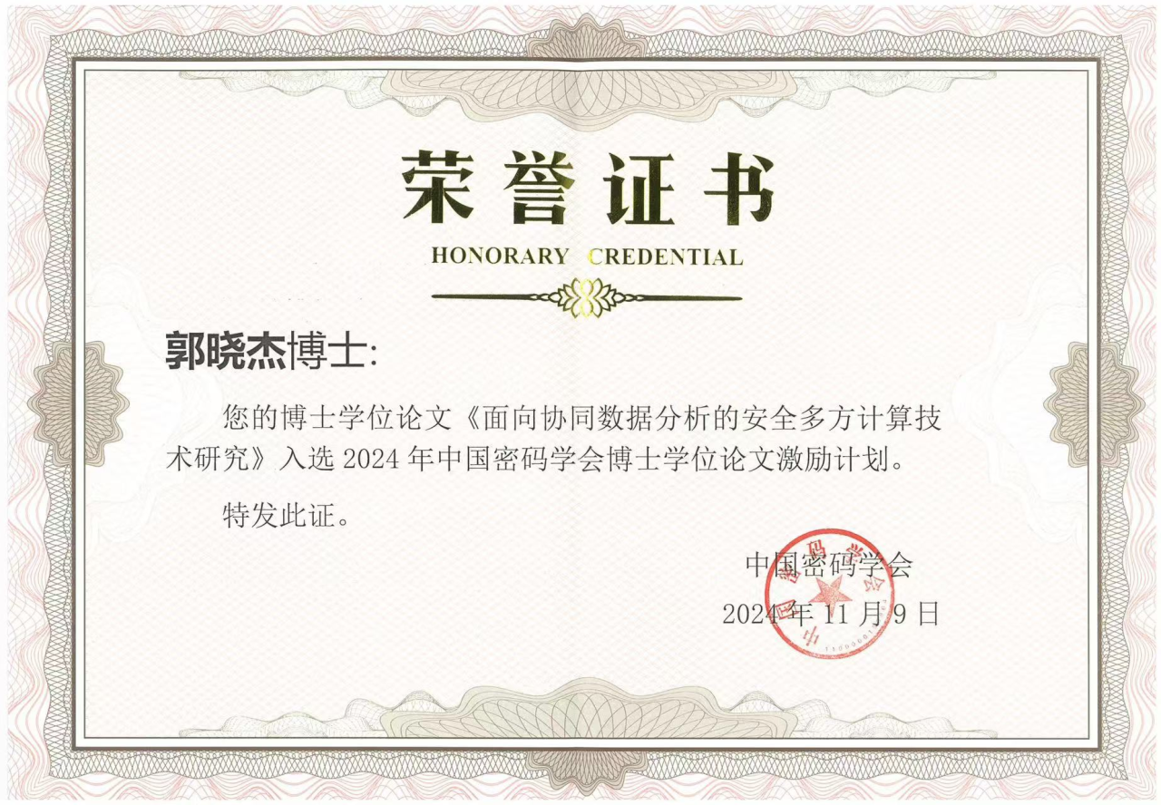 中国密码学会博士学位论文激励计划的评选为一年一度,本次评选范围为2021年6月1日‒2024年7月10日之间博士毕业生的学位论文,且论文作者需在密码学及相关领域的基础理论或应用基础研究中取得重要成果,或在关键技术以及技术创新等方面成果显著。郭晓杰博士因攻读博士学位期间在安全多方计算基础原语及其应用方面的研究工作获此奖项,毕业后,他继续进行密码学等领域的计算科学研究。