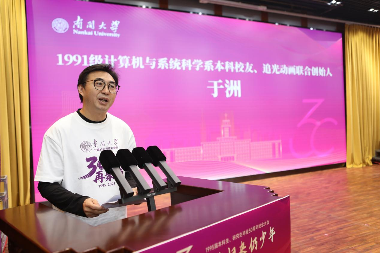 于洲做校友代表发言,以一句“上一次我们大家一起坐在主楼小礼堂,是11067天前的毕业典礼”开启深情回忆,他细数篮球赛、送别歌等青春片段,坦言“南开是我们三十年中魂牵梦绕的地方”,引发全场强烈共鸣。在发言中,于洲从张伯苓老校长的“爱国三问”与“知中国,服务中国”的志愿讲起,真诚宣告一代南开人未曾辜负老校长的期望。他动情表示,虽已“早生华发”,但大家仍是心怀“允公允能”校训、在民族复兴伟业中奔涌的“最强劲生力军”,展现了南开精神的时代回响。