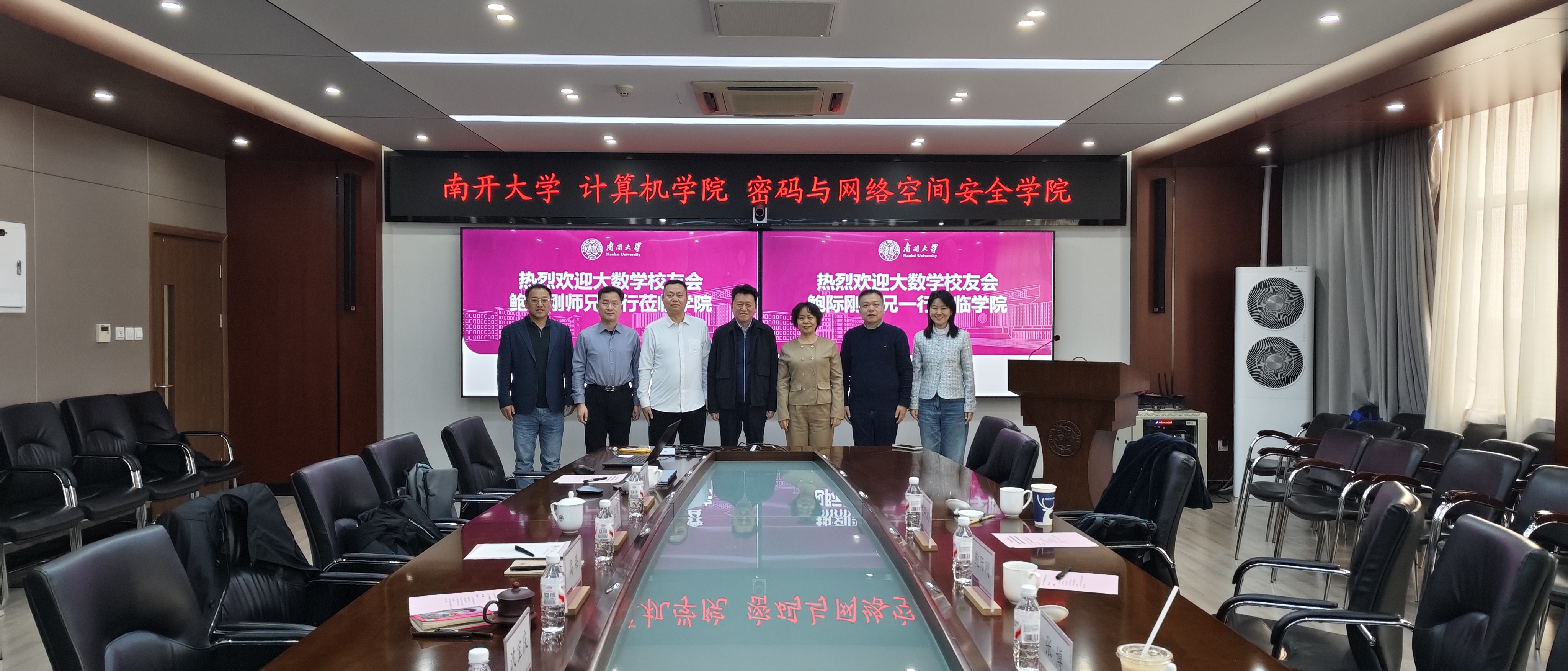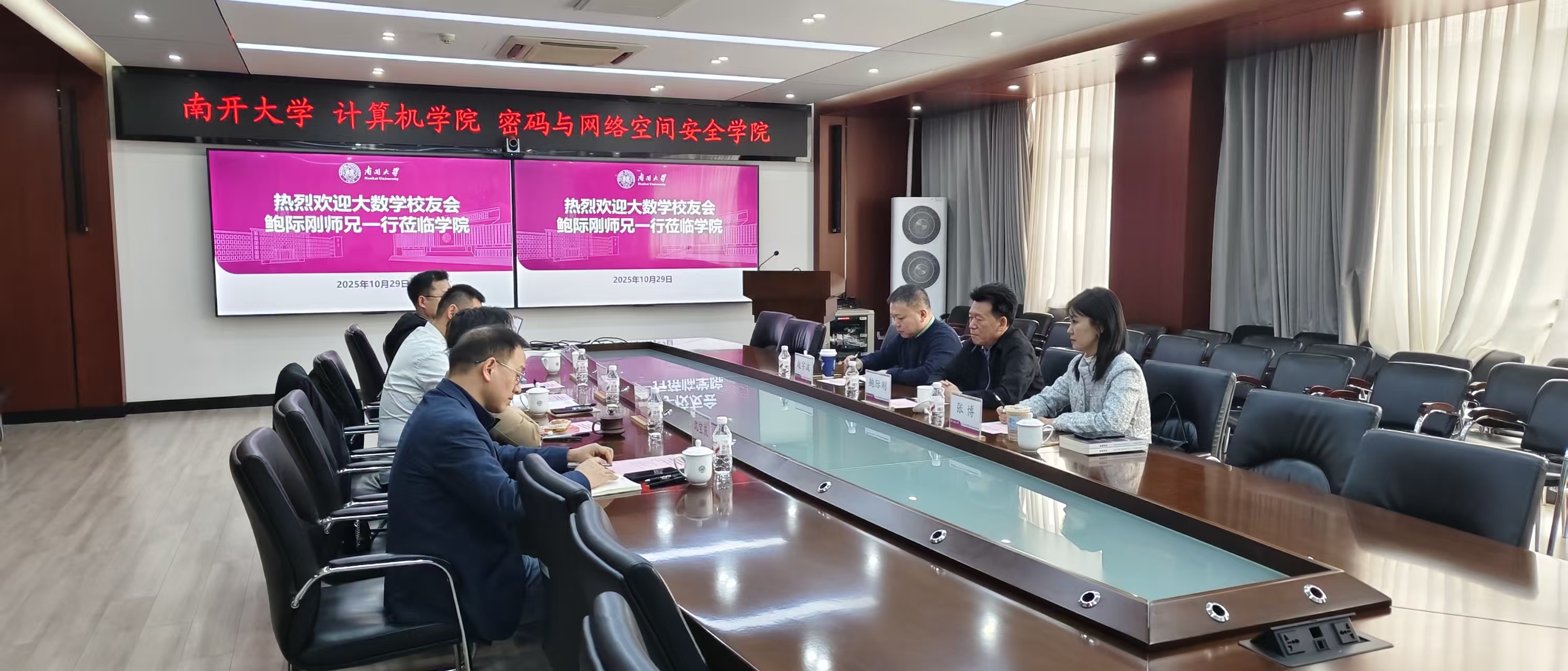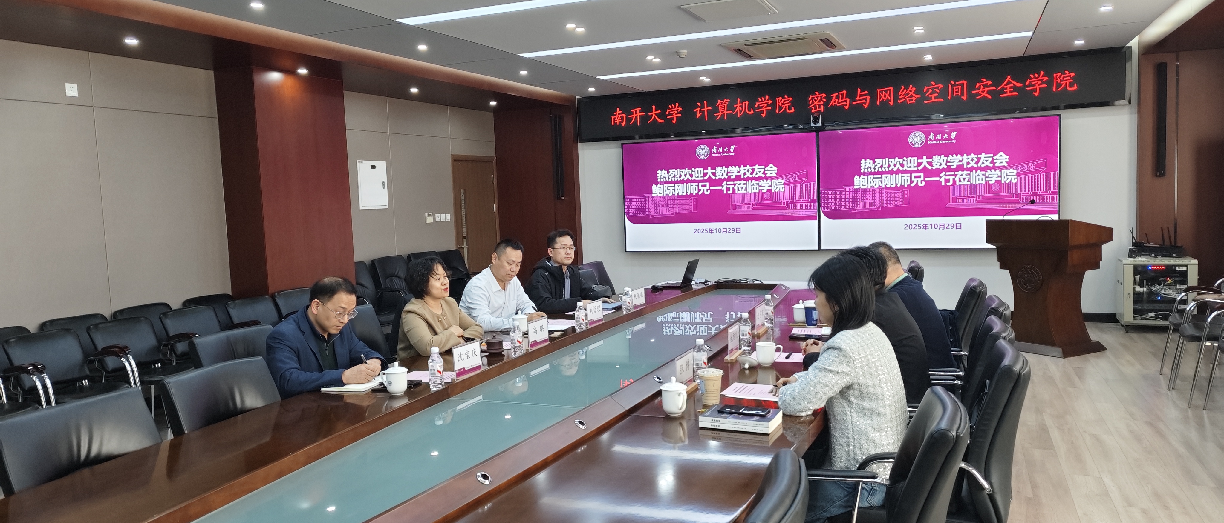 10月29日,南开大学大数学校友会代表鲍际刚、赵宇波、张博一行莅临南开大学计算机学院和密码与网络空间安全学院交流访问。学院党委书记高琪、院长刘哲理、党委副书记(副院长)沈宝庆及教师代表、卓越工程师学院执行院长程明明参加座谈。双方围绕学科建设、人才培养、校友合作等议题进行深入探讨,共谋发展新篇章。