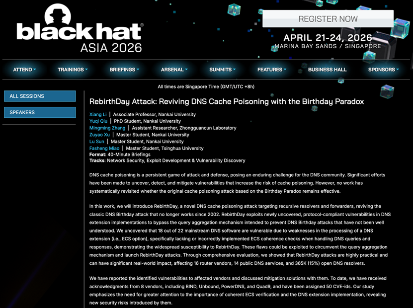 Black Hat是全球最具影响力的工业界信息安全会议之一,长期聚焦前沿攻防技术与最新安全威胁。我院李想副教授课题组论文 “RebirthDay Attack: Reviving DNS Cache Poisoning with the Birthday Paradox” 入选Black Hat Asia 2026,得到评审组高度评价:“The Review Board was highly impressed with your research”。该成果最初发表于顶级会议ACM CCS 2025。本次录用也是李想副教授自2023年以来连续第四年在Black Hat发表的第六次演讲。