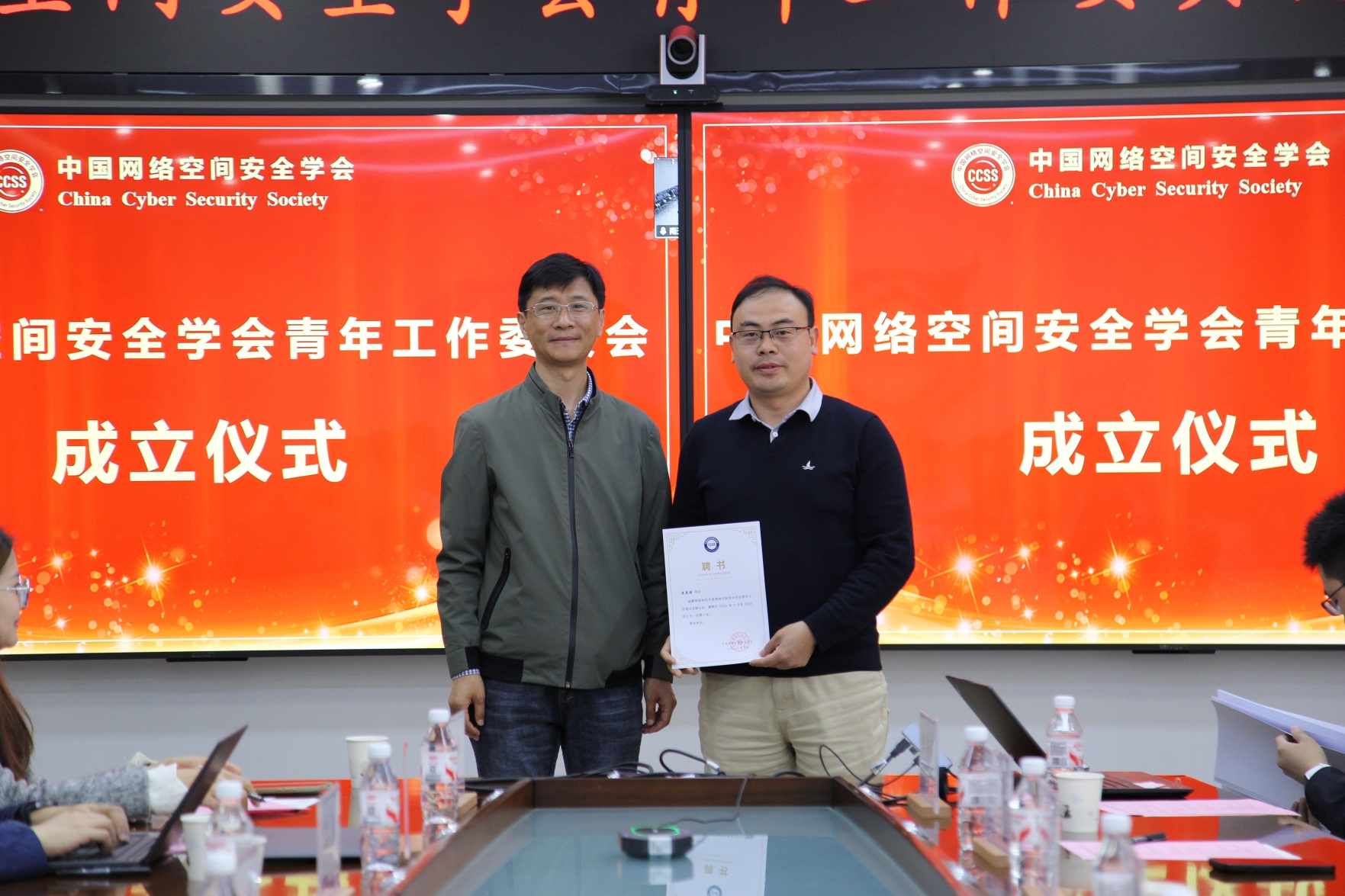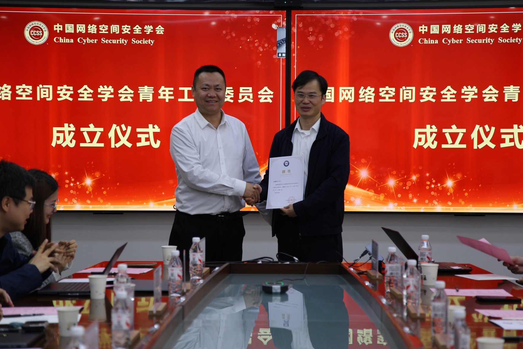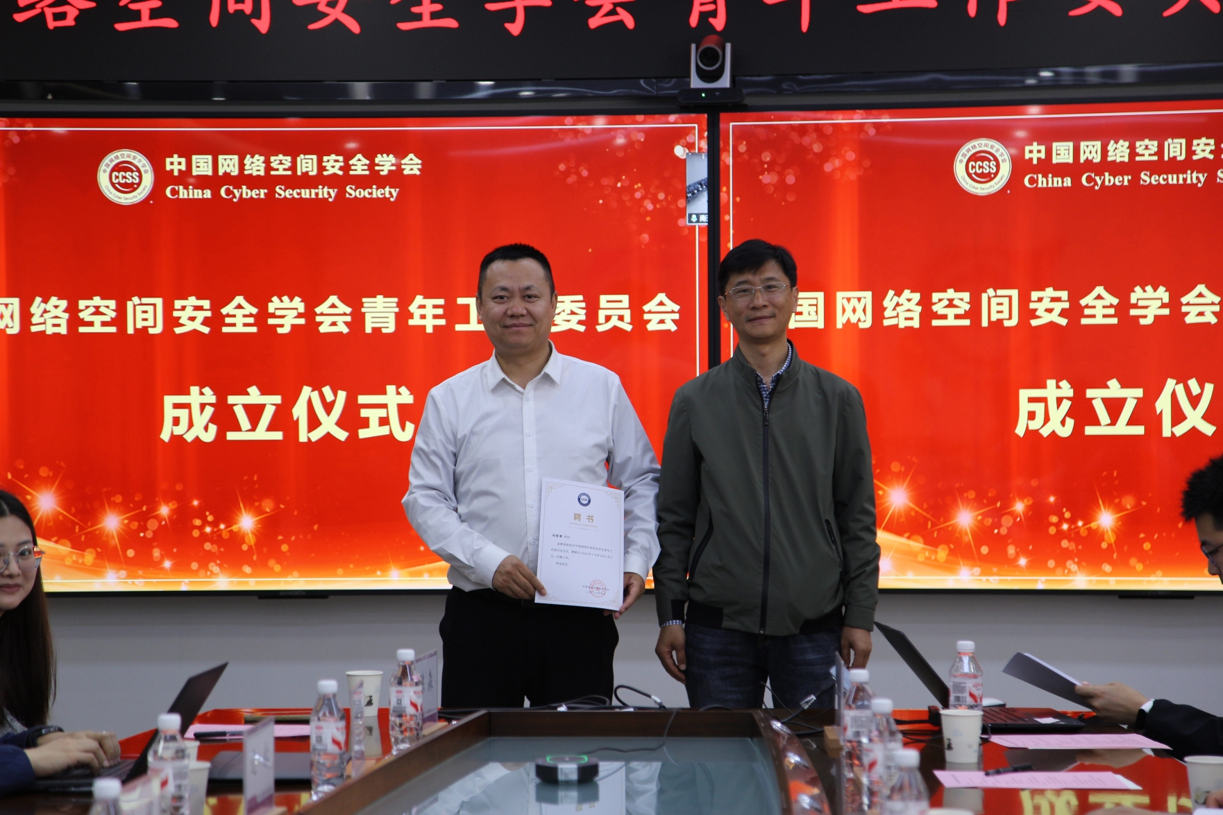 霍玮、金柏江分别致辞,庆贺青年工作委员会成立。霍玮代表中国网络空间安全学会宣读青年工作委员会成立文件及委员名单,并为主任委员刘哲理、沈超、王志波、付章杰和各位委员颁发聘书。付章杰主持成立仪式。