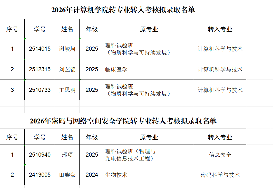 以上是计算机学院、密码与网络空间安全学院2026年转专业转入考核拟录取名单,公示期4月17日-4月20日